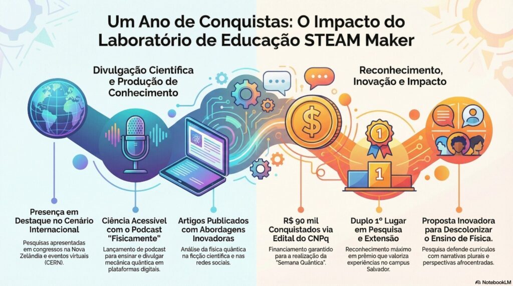 O Grupo de Pesquisa Laboratório de Educação STEAM Maker, do Instituto Federal de Educação, Ciencia e Tecnologia da Bahia (IFBA) – campus Salvador, encerra 2025 com uma série de conquistas nas áreas de pesquisa, extensão e inovação pedagógica. Sob coordenação de Rafaelle Souza, o grupo consolidou seu trabalho com foco em Física Moderna e Quântica, Educação STEAM Maker, metodologias ativas e perspectivas decoloniais de ensino, alcançando reconhecimento interno e projeção nacional e internacional.